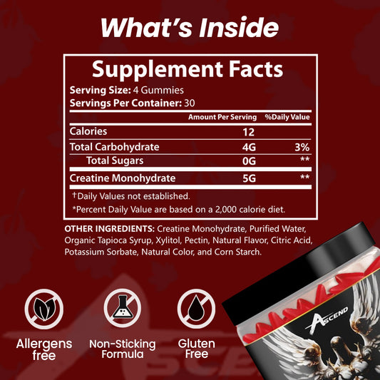 Take 4 Ascend Creatine Gummies every day to keep your muscles strong and full of energy. For the best results, have them before your workout to boost performance, endurance, and muscle growth. Even on rest days, keep taking them to help your body recover and stay energized!